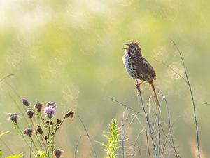 A Song Sparrow (Melospiza melodia) holds a short concert at West Lake Nature Preserve in Chelsea, MI