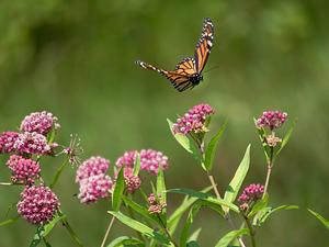 A Monarch butterfly (Danaus plexippus) is taking a break from pollinating work at a patch of swamp milkweed at West Lake Preserve in Chelsea, MI