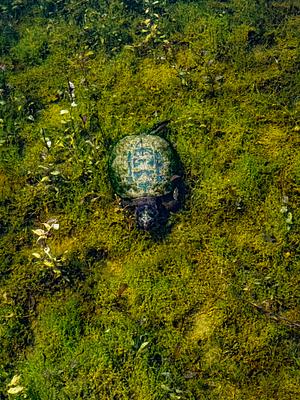 A snapping turtle (Chelydra serpentina) does his best to blend in with the lake floor at Huron Meadows Metropark in Brighton, MI.