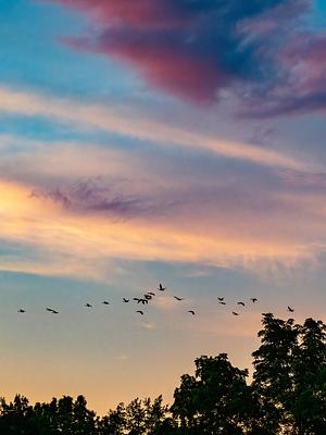 A flock of Canada Geese fly above the trees in formation above Trinkle Marsh at Easton Farms Preserve in Washtenaw County, MI.