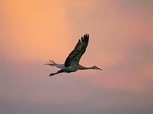 A solitary Sandhill Crane flies to reunite with the rest of its flock in Dexter, MI
