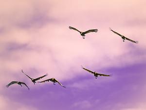 Six Sandhill Cranes soar above the skies at Trinkle Marsh Preserve in Dexter, MI.