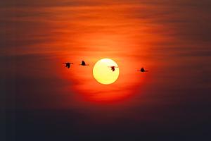 Composite image of a Sandhill Crane captured in silhouette as it flies across a brilliant sunset in Washtenaw County, MI