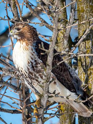 A gorgeous Red-Tailed Hawk poses for a profile photo at the Matthei Botanical Gardens in Ann Arbor, MI
