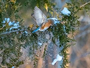 An Eastern Bluebird dances on a juniper branch to remove snow and reveal berries hiding underneath. Taken at Hudson Mills Metropark in Washtenaw County, MI.