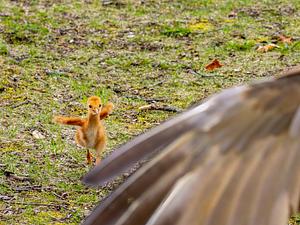 A Sandhill Crane colt scrambles to keep up with his mom at Kensington Metropark in Milford, MI.