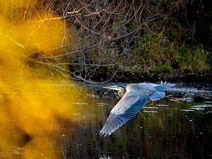 A great blue heron glides above Watkins Lake in Washtenaw County, MI