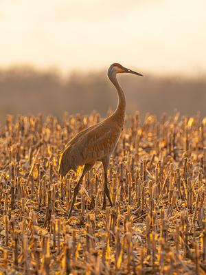 A Sandhill Crane strides across a field at the peak of golden hour; captured in Washtenaw County, MI