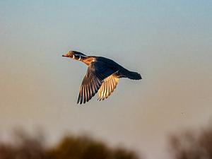 A Wood Duck drake takes off in golden hour outside Trinkle Marsh Preserve in Dexter, MI