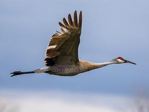 A Sandhill Crane flies past, focused on their partner offscreen, taken at Halfmoon Lake in Pinckney, MI